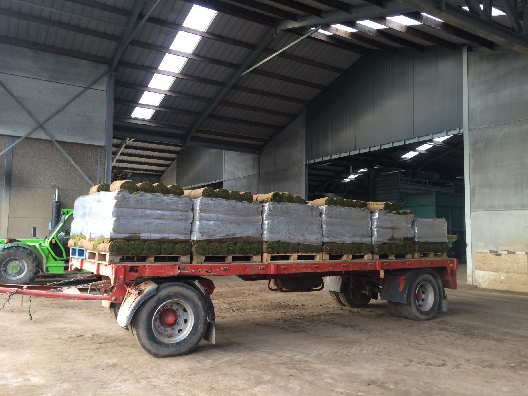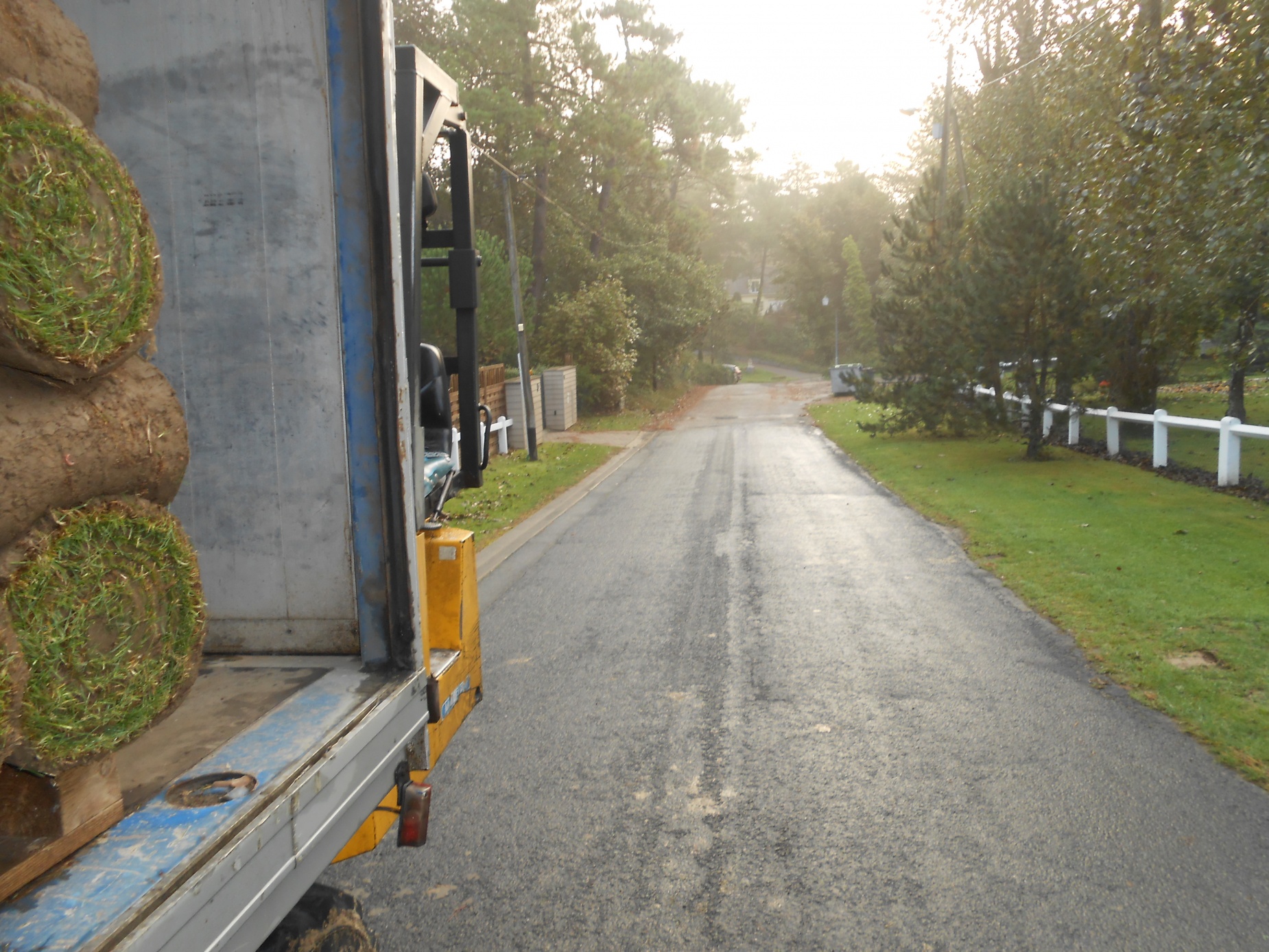 Nous effectuons la livraison avec notre propre camion qui dispose d’un charriot élévateur. Cela nous permet de déposer votre gazon en plaque là où vous le souhaitez.